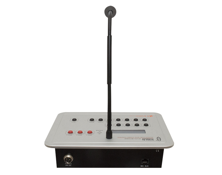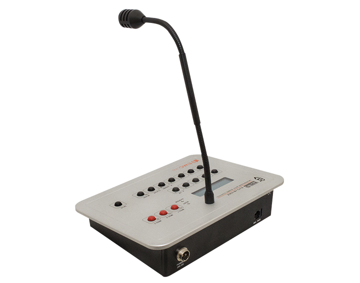 Digital desk microphone with display and programmable buttons up to 999 programmable zone call combinations.