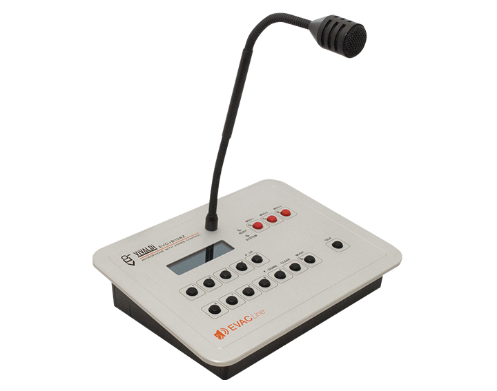 Push-to-talk button for single zone or general voice evacuation and/or announcements, supplied.
