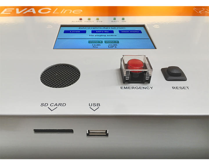 • Backlit 4.3 "display with touch screen for selection of alert and evacuation zones and menu navigation for level adjustment, device configuration, fault display