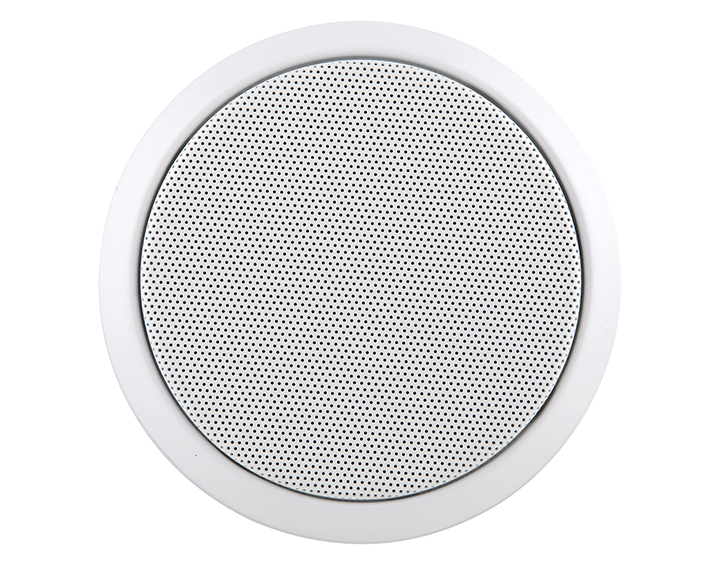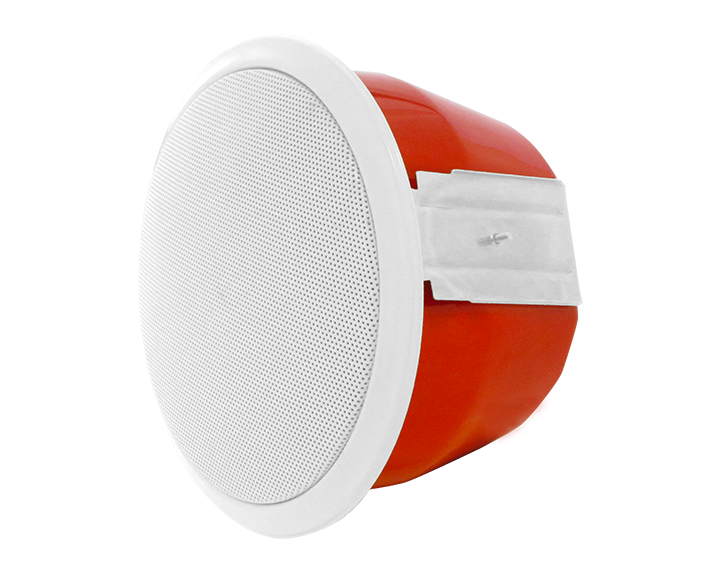 In-ceiling round speaker with steel flame-resistant cap, provided with firebreaker kit.
