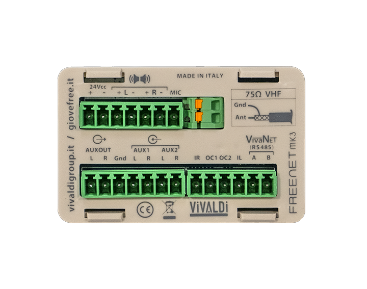 • 2x AUX Input for local sources (eg TV, CD, PC) or audio matrices (Vivaldi Giove MULTIMEDIA CA28, Vivaldi Giove MULTIMEDIA CA28L, Vivaldi Giove MULTIMEDIA CA28+).