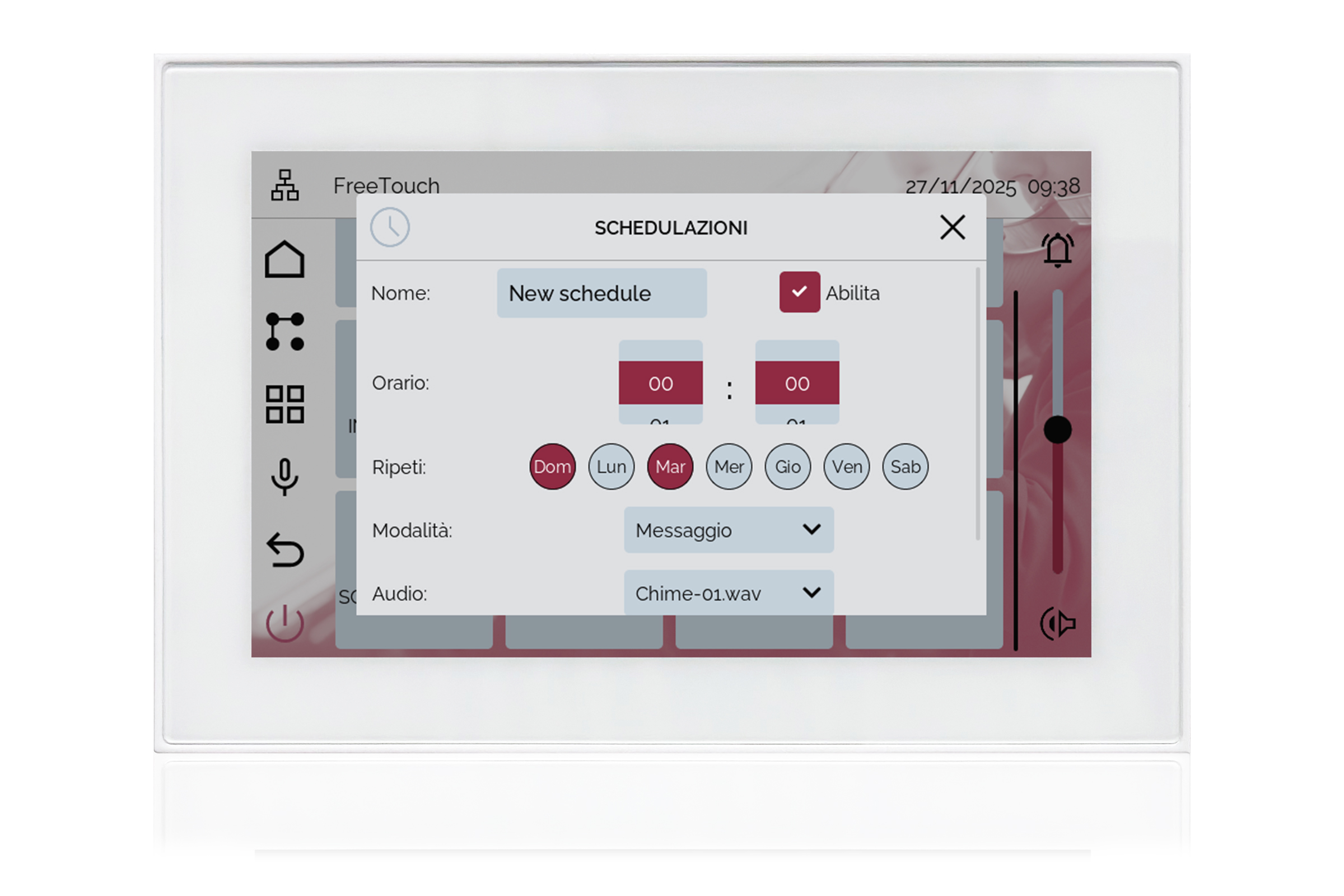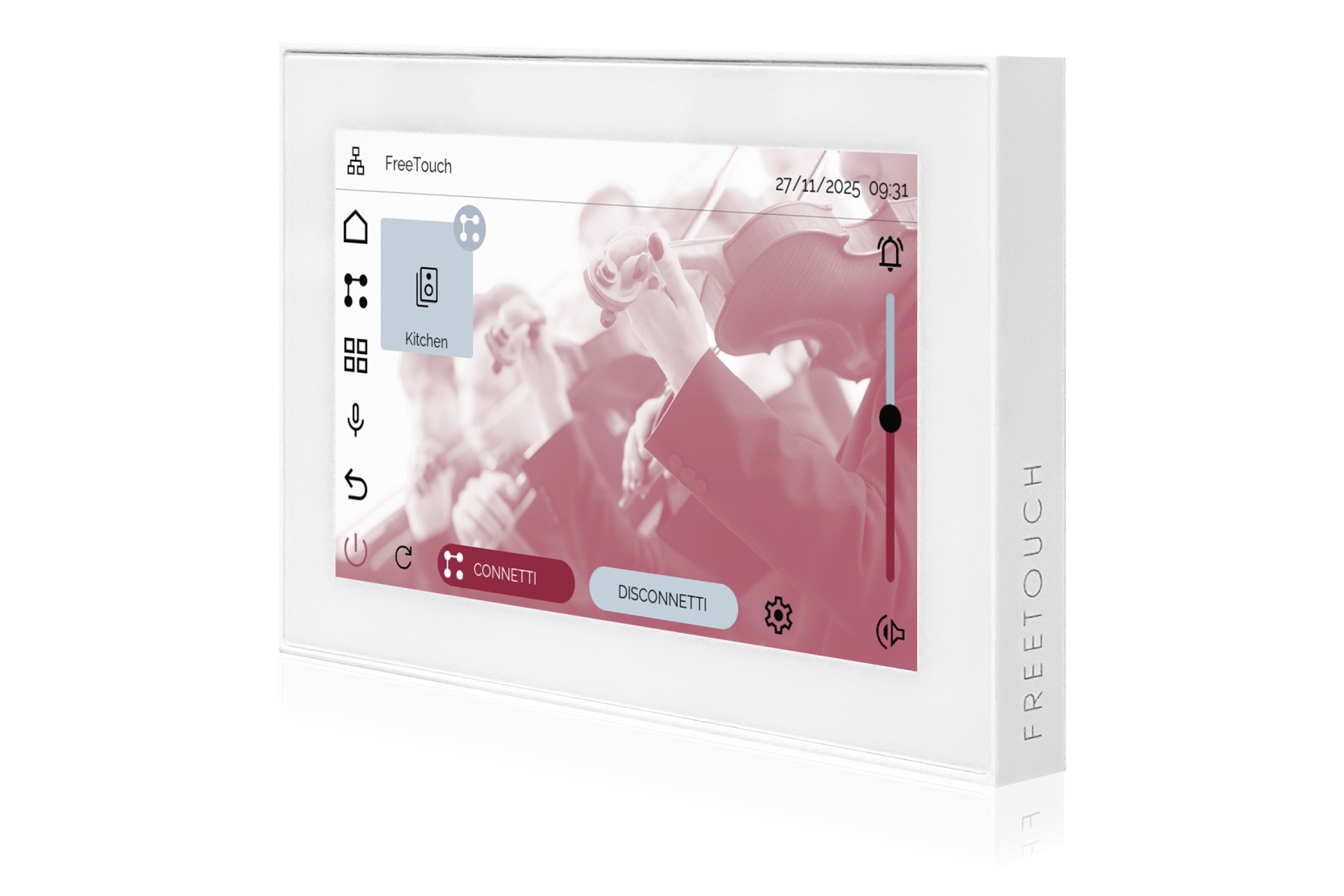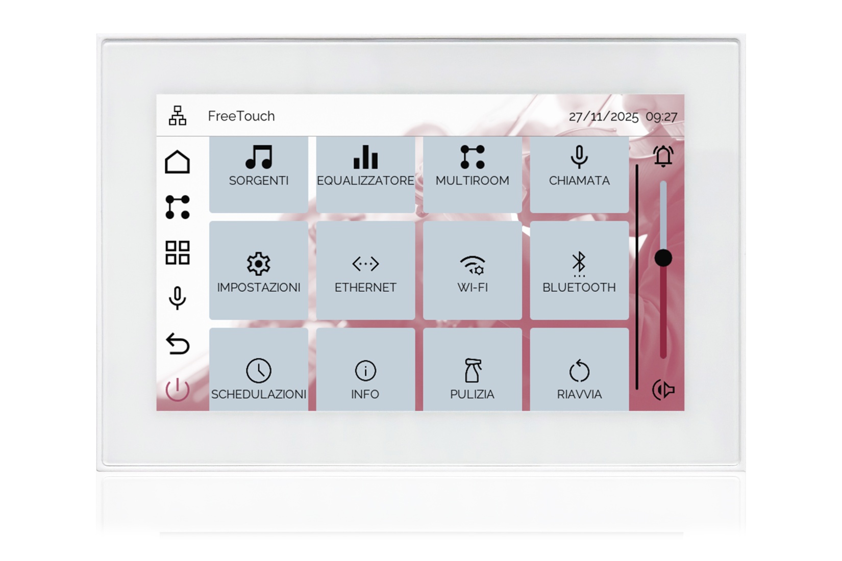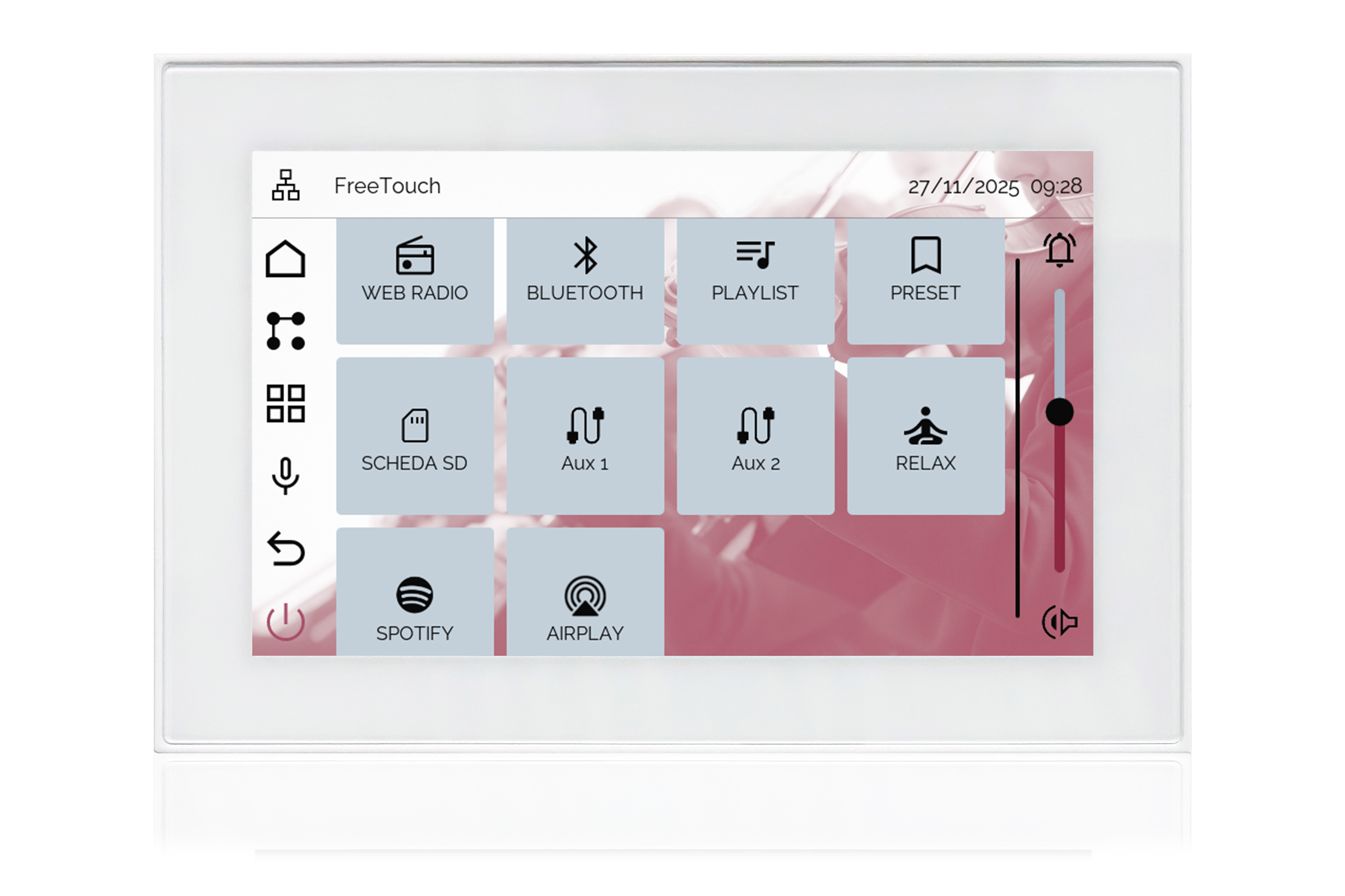 TOUCH version of audio multimedia device, for home automation integration, stereo amplifier, microphone, with integrated sources and player