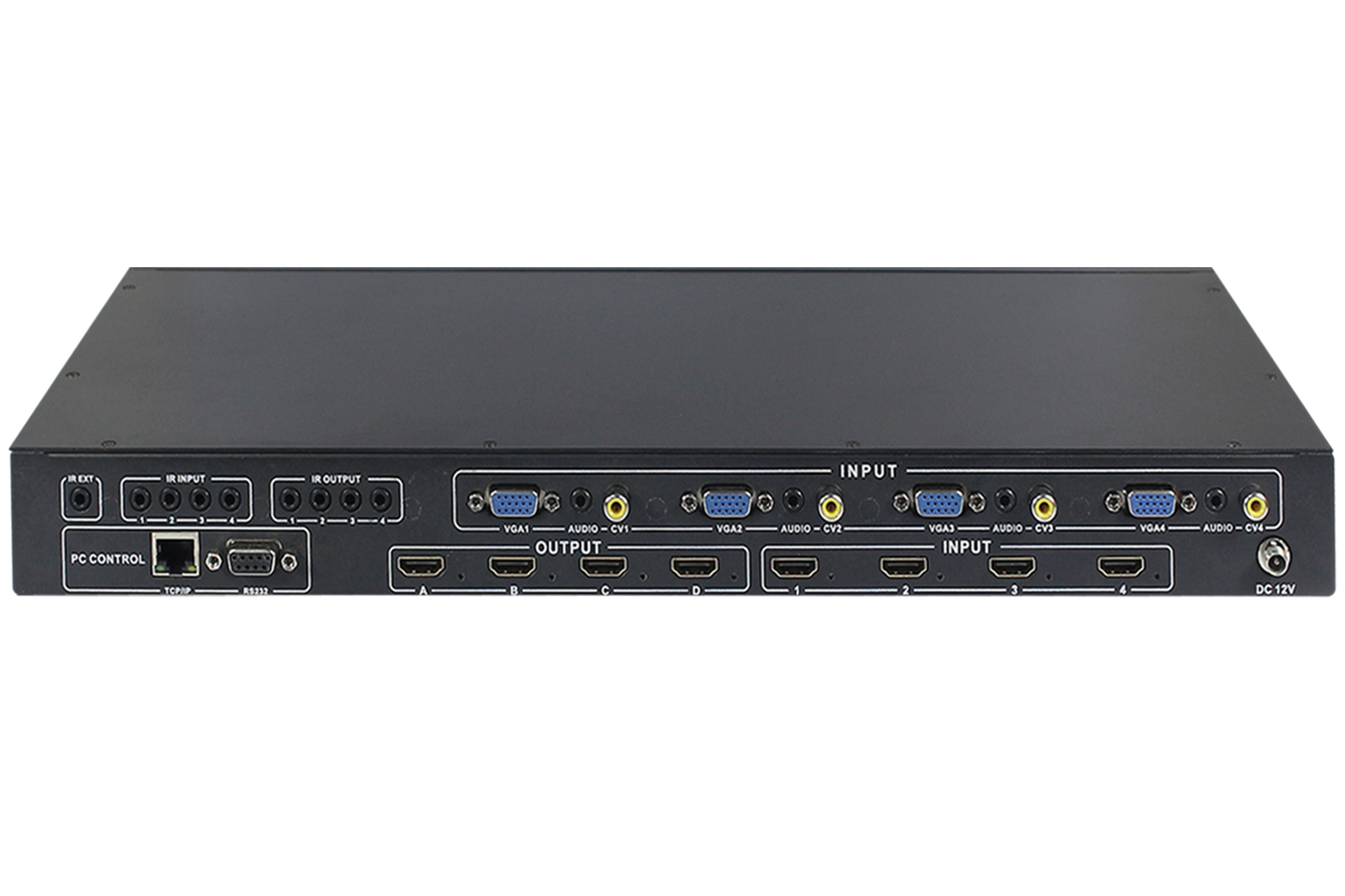 Routes 4 HDMI/VGA + audio analog inputs signals to 4 HDMI video output without disconnection of the video signal with the possibility of setting the output resolution.