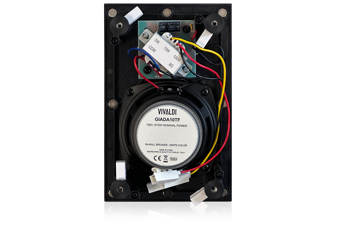 Installation on plasterboard, wood walls or similar: no accessories needed, the speaker is provided in the rear with hook-shaped anchors for stable fixing.