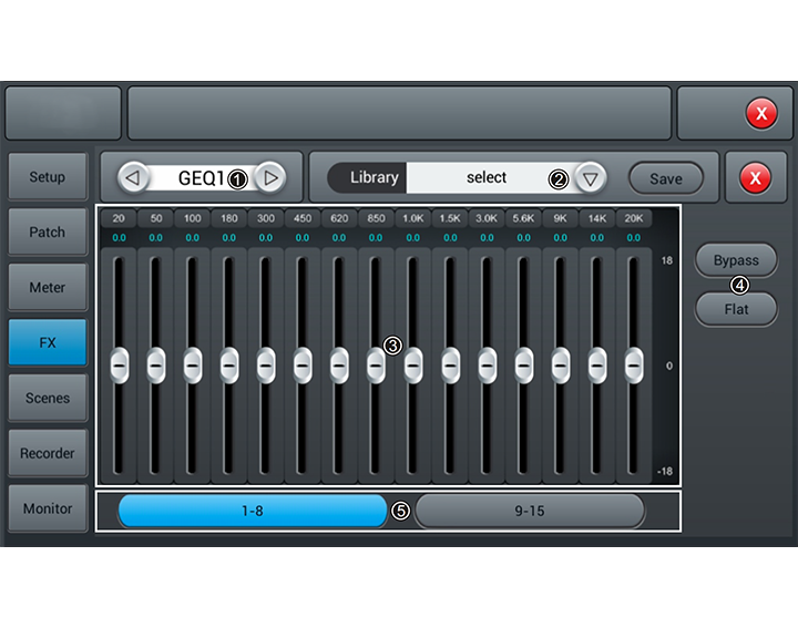 Up to 8 assignable effects (reverb, modulation, ECHO, 15 bands GEQ)