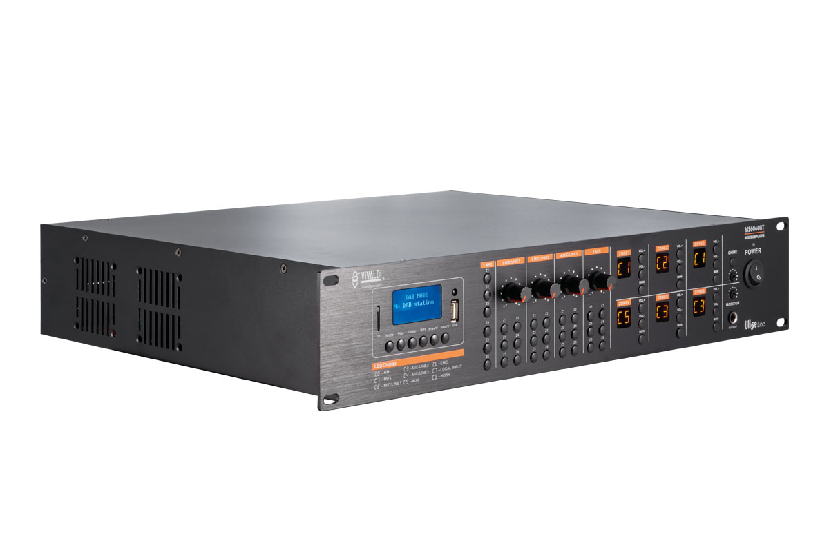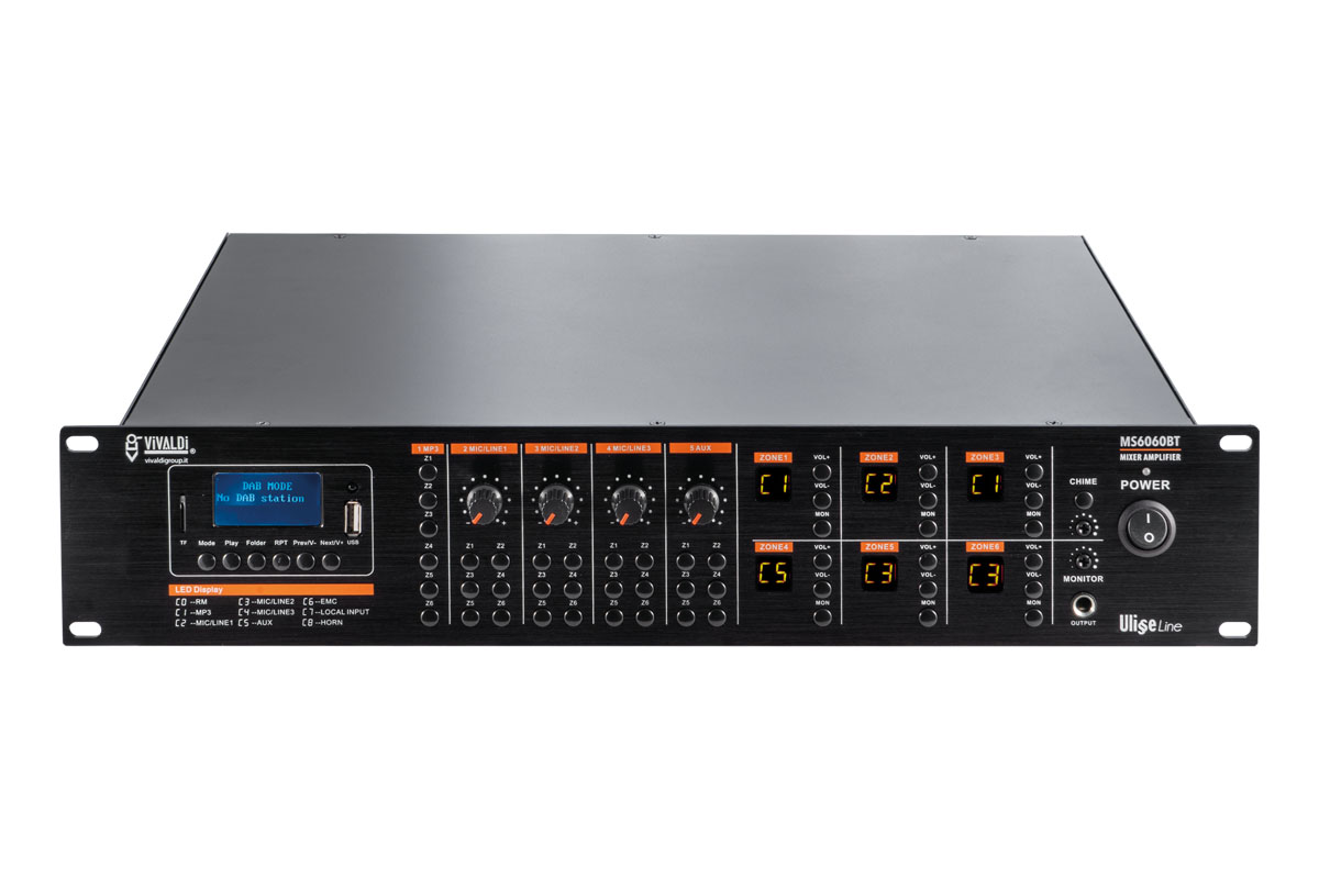 Multi-zone amplifier 6x60W matrix with BLUETOOTH source, DAB+RADIO, TUNER FM, USB and SD CARD integrated for MP3 audio files reading.