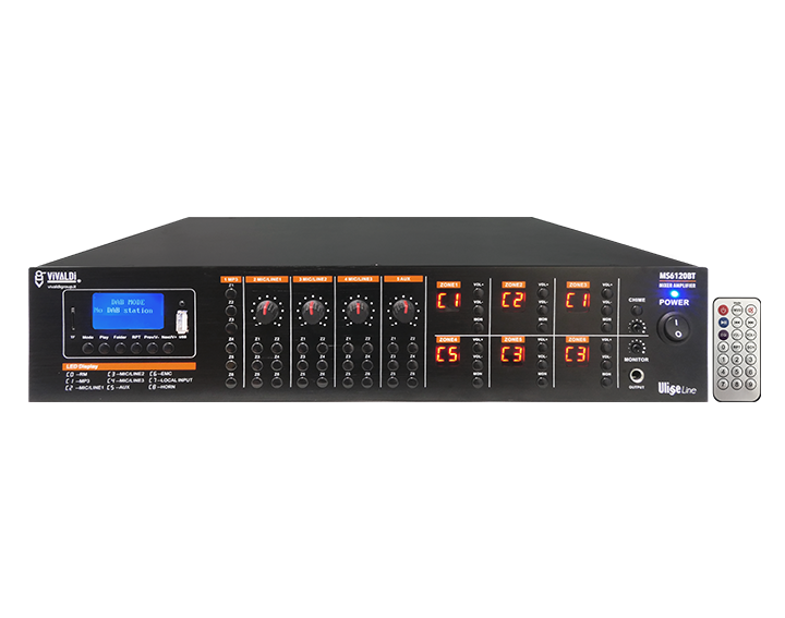Multi-zone amplifier matrix 6x120W with BLUETOOTH source, DAB+RADIO, FM TUNER, USB and SD CARD integrated for MP3 audio files reading.
