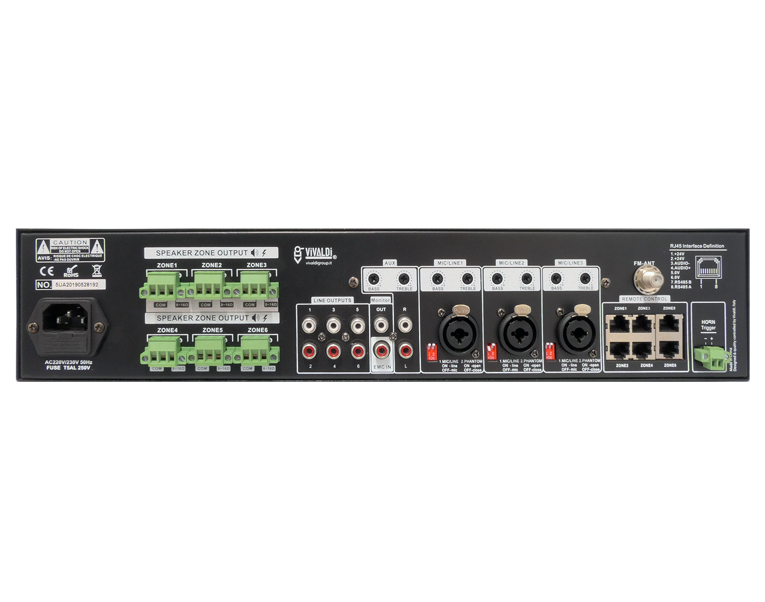 6 Output RJ45 for zones control or multi-zone desk microphone via Vivaldi Ulisse BS6*.