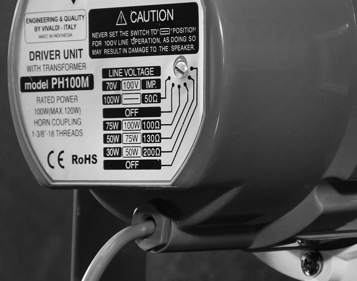 Nominal power: 50/75/100W. 150 peak, max 133dB.