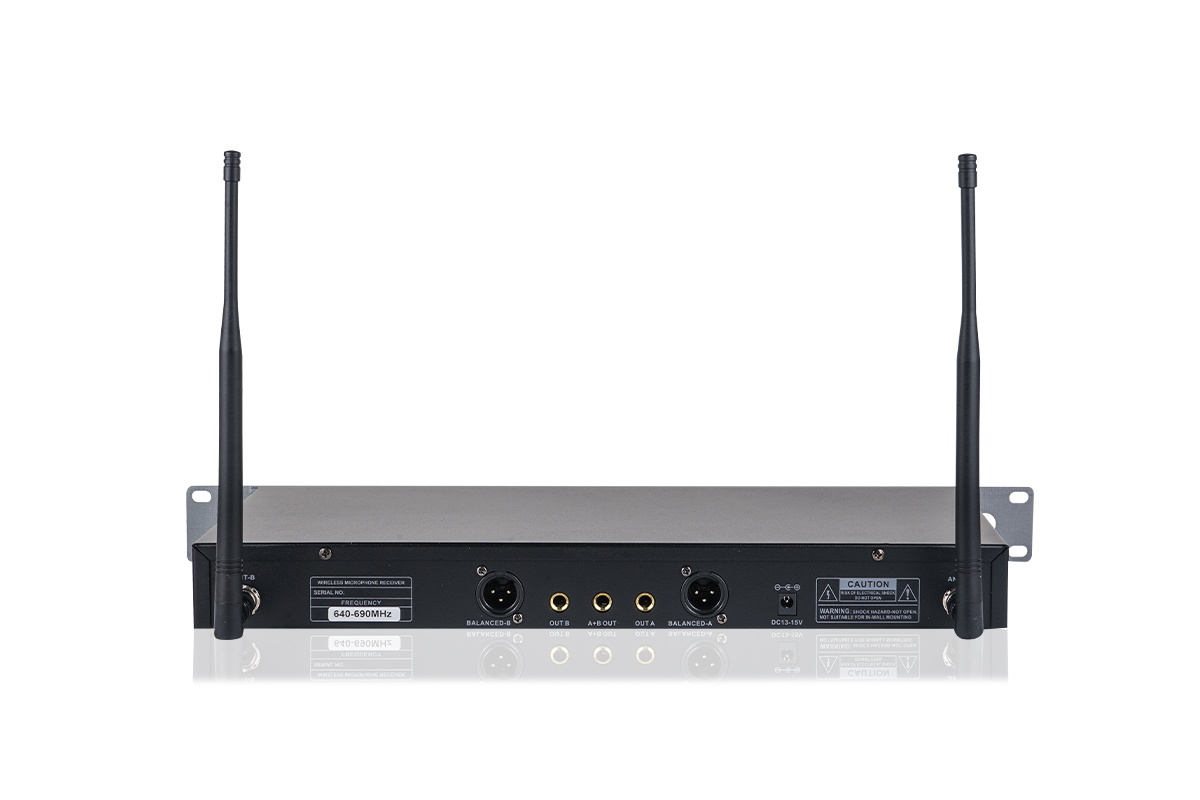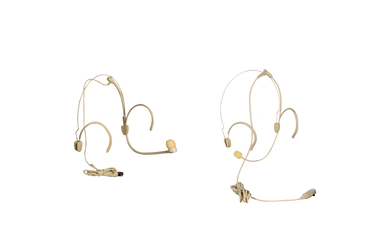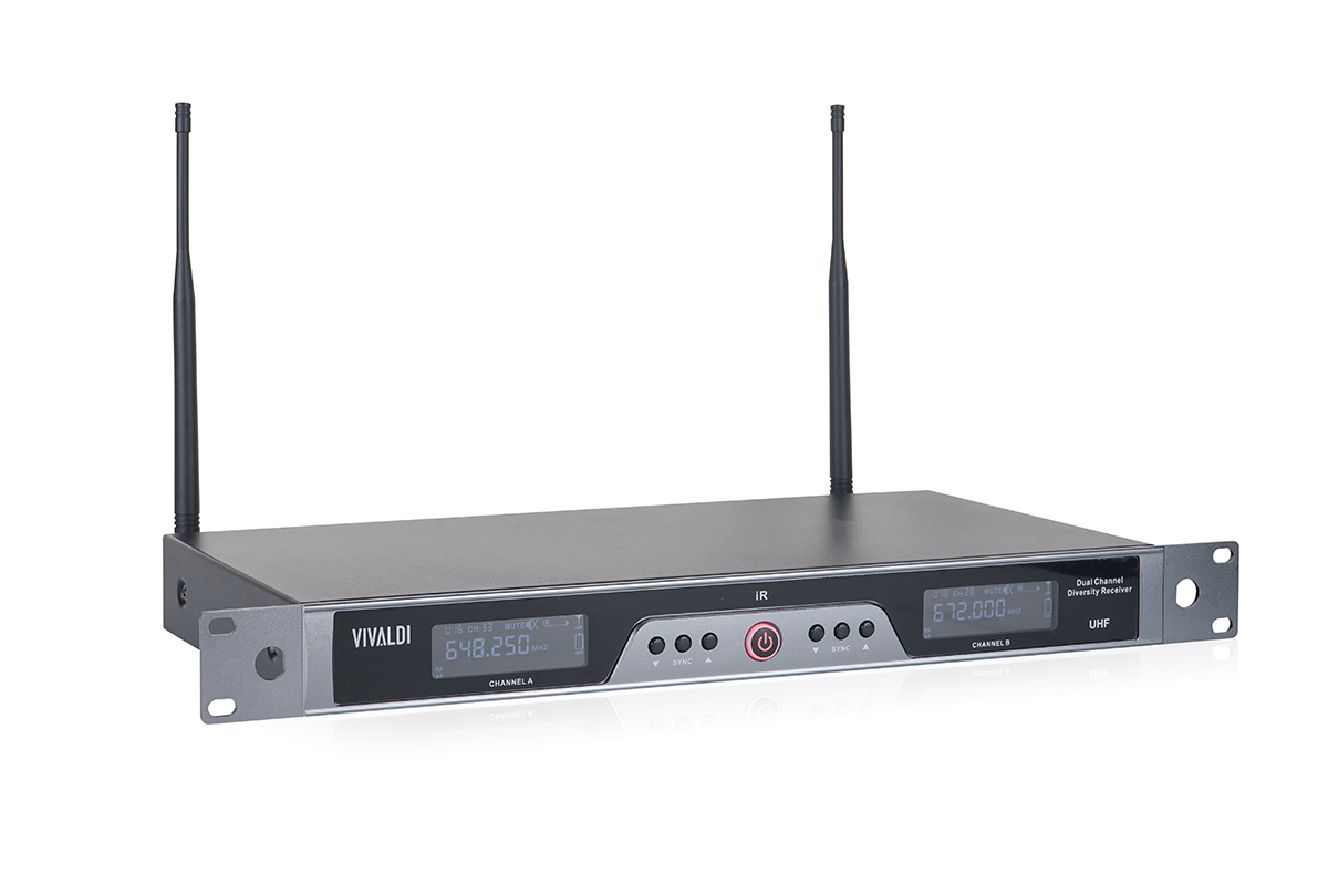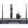 Double radiomicrophone kit with lavalier+ 1 speech headset + 1 singing headset + handhead trasmitters, double table receiver integrated in a single cabin et with 1 rack unit.