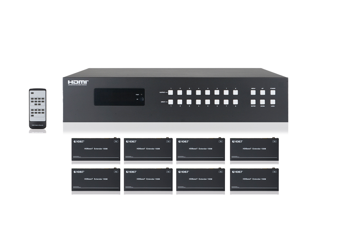 Kit matrice HDMI/HDBaseT 8x8 completa di 8 extender 150mt; permette di indirizzare 8 sorgenti HDMI audio/video in ingresso