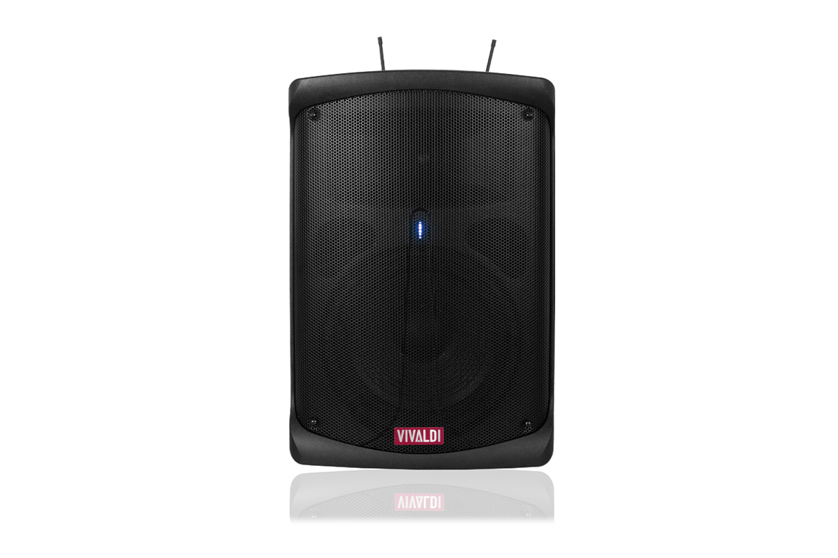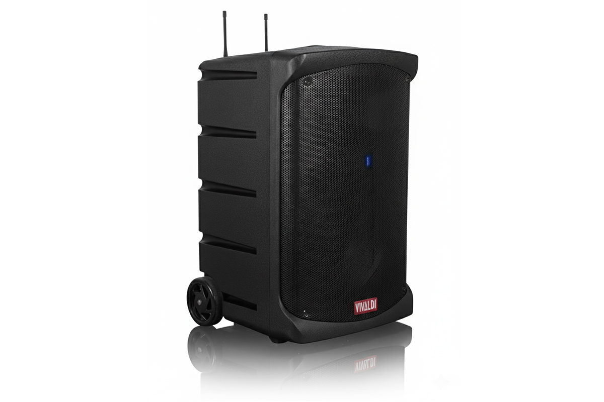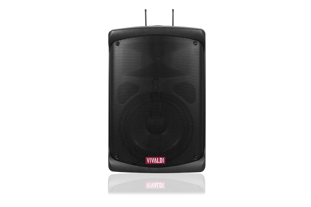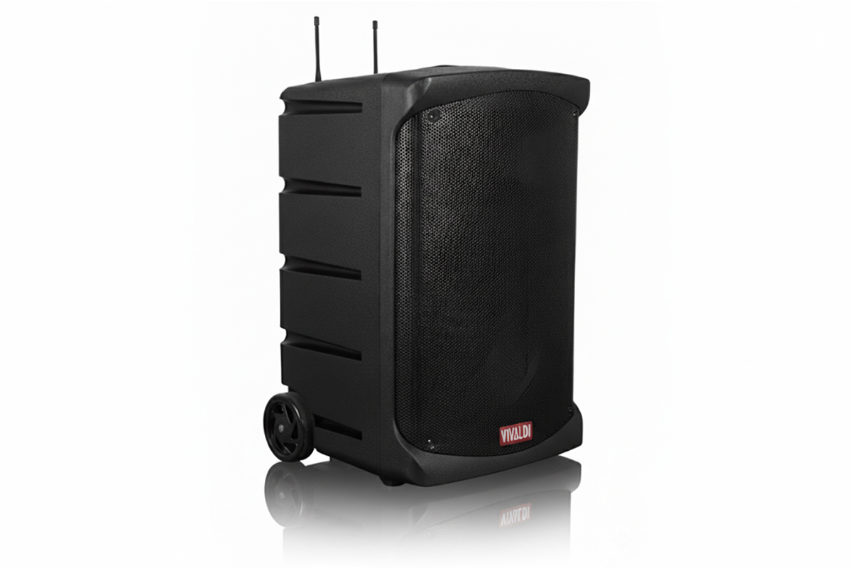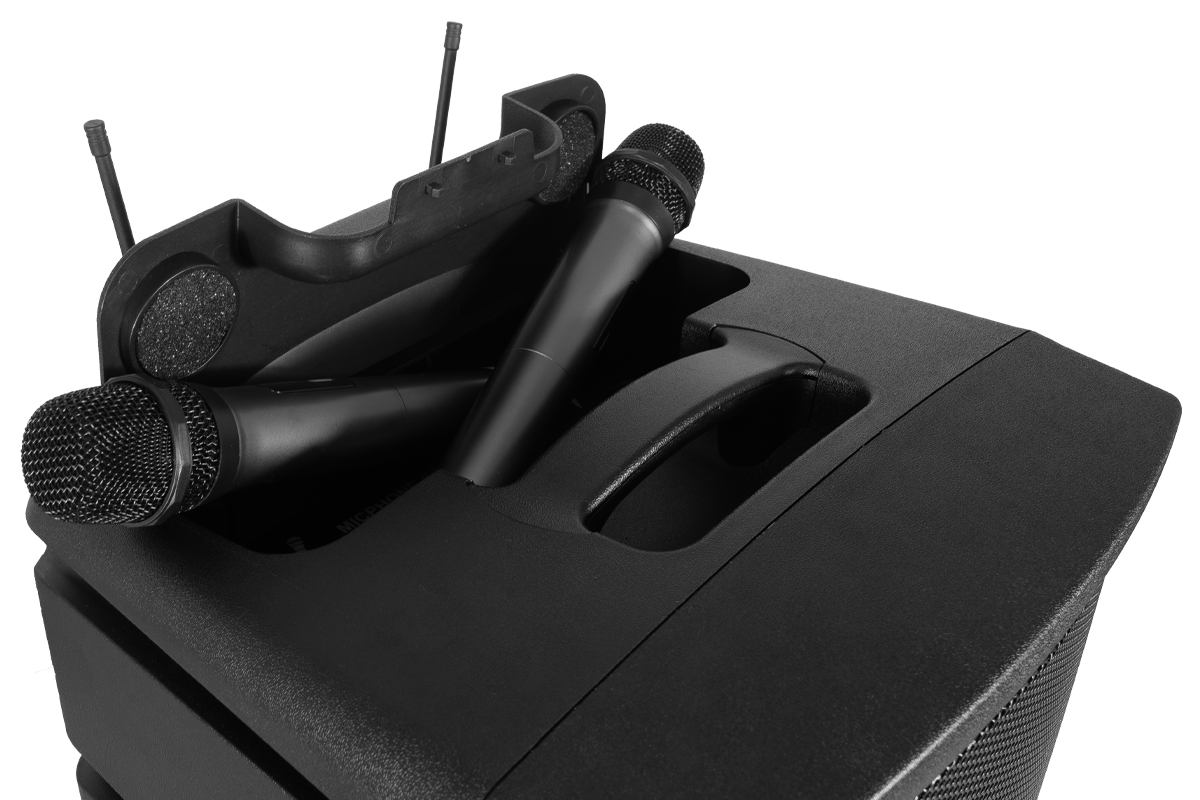 Diffusore portatile a 2 vie, attivo, completo di player e 2 radiomicrofoni.