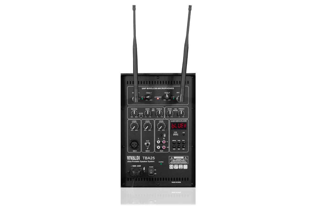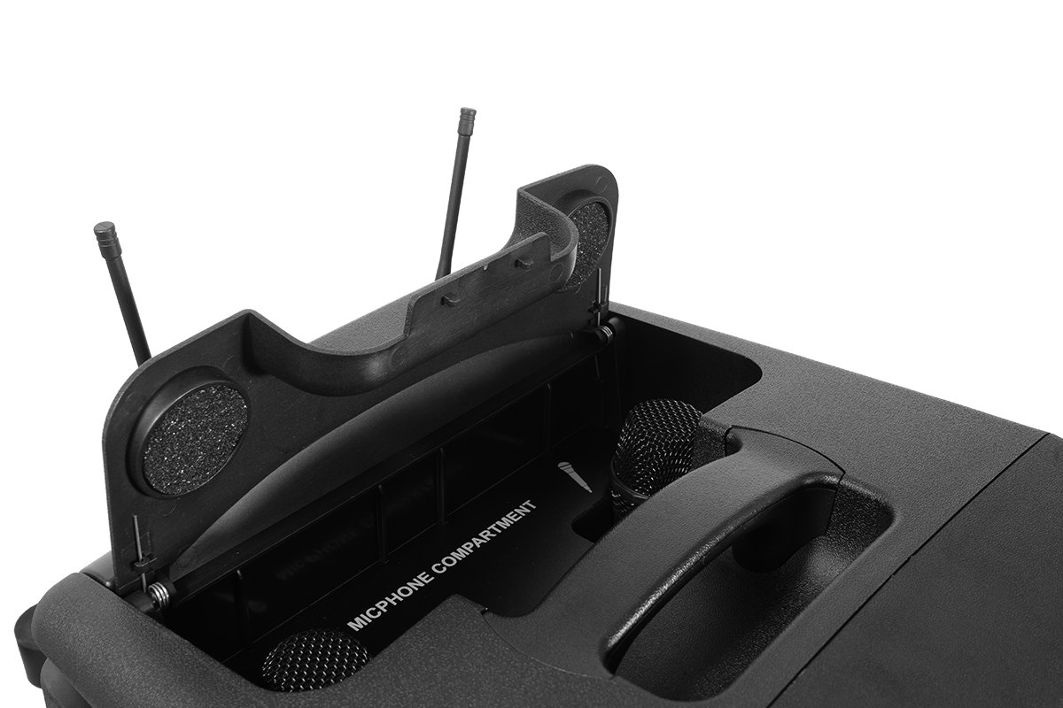 5 canali audio miscelati tra loro: 2 radiomicrofoni, 1 ingresso XLR per microfono dinamico, 1 ingresso per strumenti musicali (Jack 6,3mm HI Z), una sezione condivisa tra BT, USB e ingresso AUX (con connettori minijack e RCA).